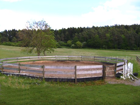 Direkt neben dem Reitplatz befindet sich ein Roundpen mit Drainagerohr. Er wird gerne für die Arbeit mit Jungpferden oder zum Longieren genutzt.
